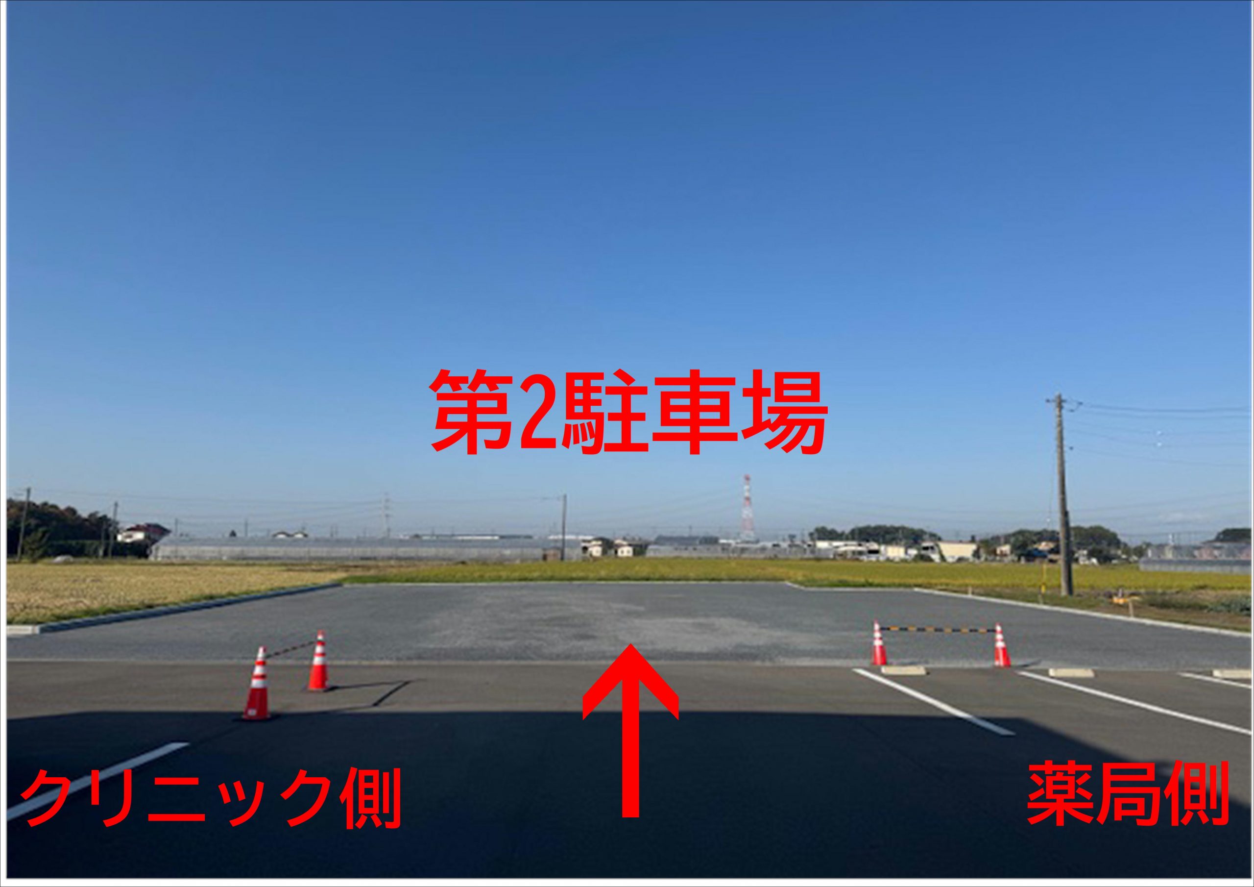 クリニック前の駐車場が混雑している際には、クリニックと薬局の間の道を西に進みますと砂利の駐車場(第2駐車場)がありますのでご利用ください。